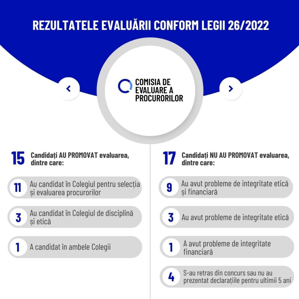 În total, Comisia de evaluare a procurorilor a evaluat în temeiul Legii nr. 26/2022, 32 candidați pentru funcții în Colegiul de disciplină și etică și Colegiul pentru selecția și evaluarea procurorilor din subordinea Consiliului Superior al Procurorilor. Dintre aceștia, 15 candidați au promovat evaluarea, iar 17 – nu.