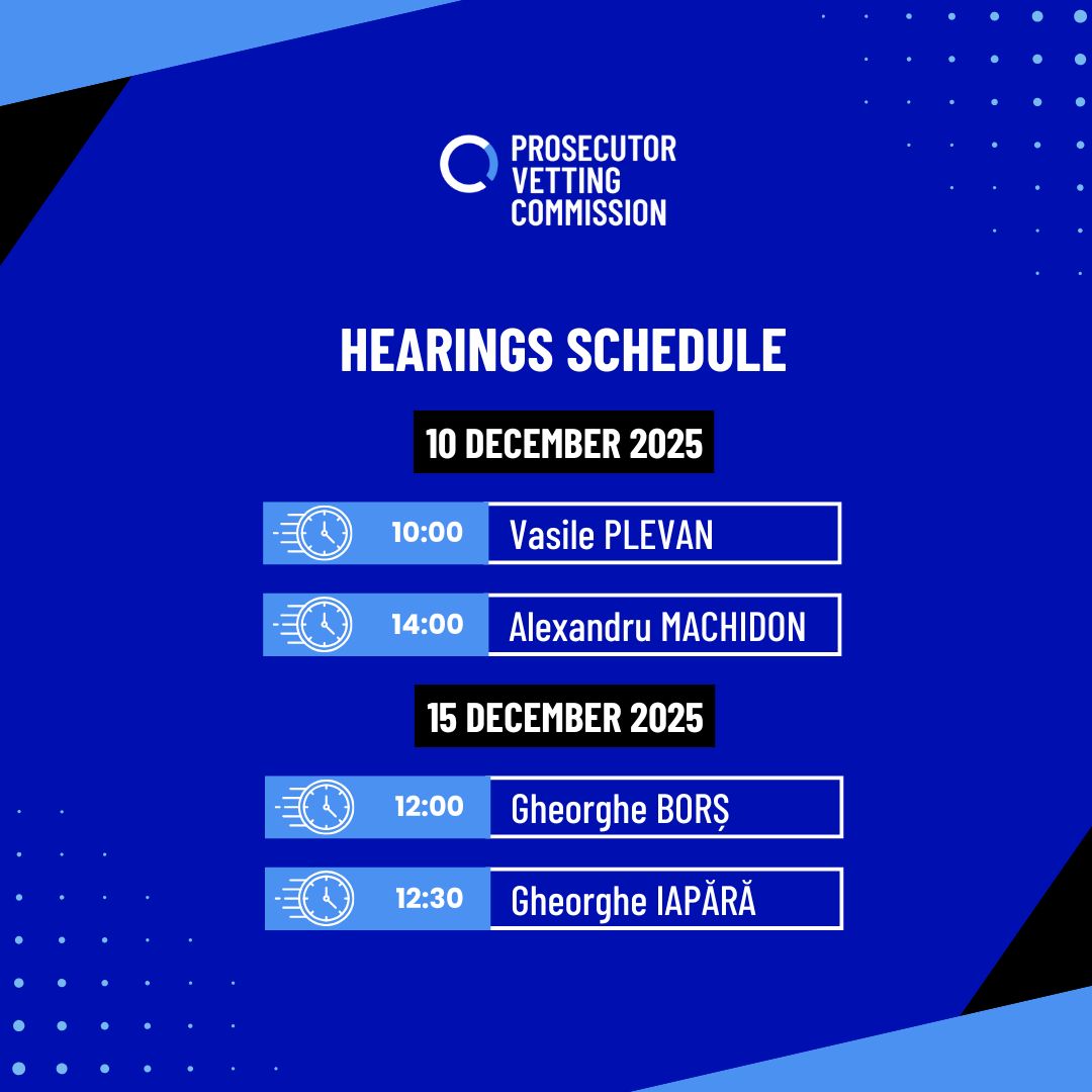 The Prosecutor Vetting Commission announces the schedule of hearings for December 2025. The first two hearings will be conducted by Panel A on 10 December 2025: